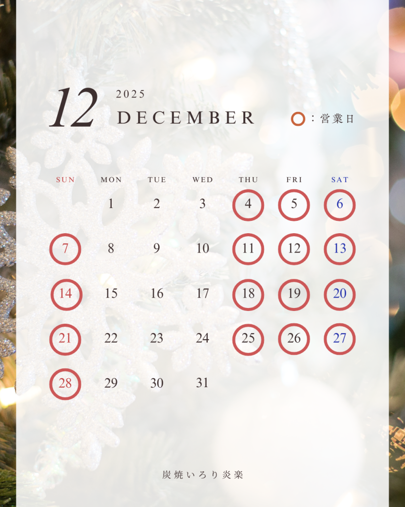 【炭焼いろり炎楽】の2025年12月のカレンダーです♪