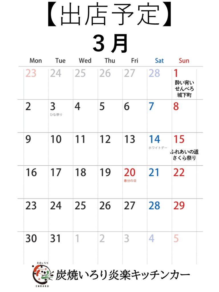 【キッチンカー炎楽】の3月の出店カレンダーです♪
